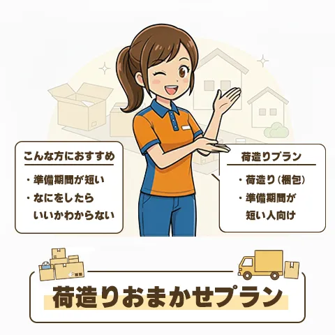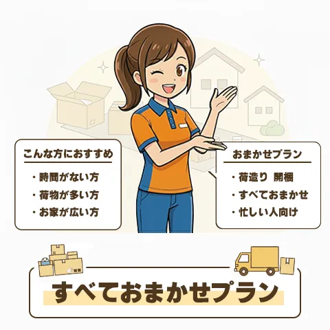 荷造りをプロにお任せいただき荷解きをお客様にしていただくプランになります。引越しまでの期間が短く、荷造りが間に合わない、荷ほどきしながら、自分で整理をしたい方にオススメのプランです!※引越しとセットになります。荷造りだけではご依頼いただけません。