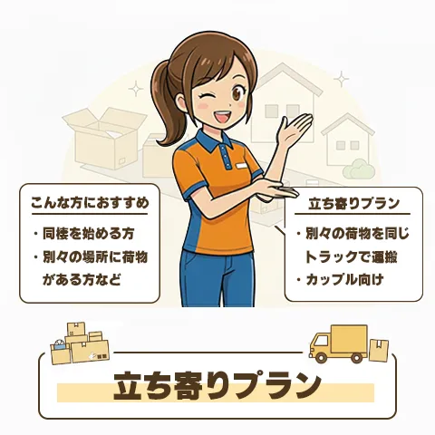別々の場所にある家財を同じトラックに積み込み1か所にお届けするプランになります。カップルの方が同棲をスタートするのに人気なプランです!