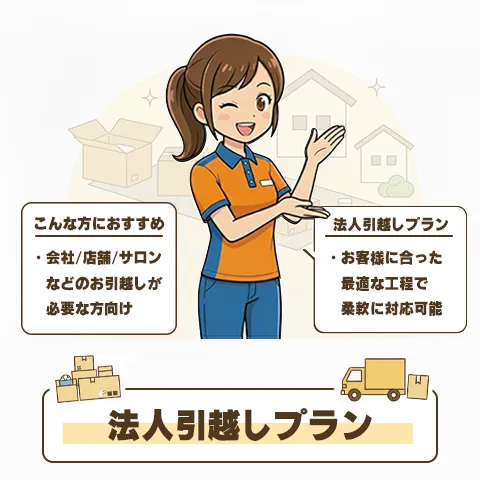 急な転勤、トラブル、退去日が迫っているなど1週間以内の引越しが必要になってしまった方。荷造りが間に合わない方も安心の当日梱包を一緒にさせて頂くプランになります。引越し後の荷解きをお客様自身で行っていただく必要がございます。