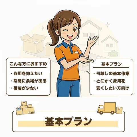 お引越しの大型家具などの梱包からセッティングまでの基本作業がセットになった標準的なお引越しのプランです。荷造りおよび荷解きをお客様自身で行っていただく必要がございますが、とにかく費用を抑えたい方にオススメのプランです!
