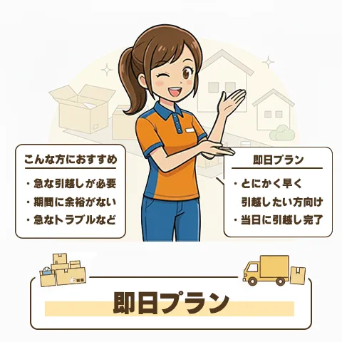 急な転勤、トラブル、退去日が迫っているなど1週間以内の引越しが必要になってしまった方。荷造りが間に合わない方も安心の当日梱包を一緒にさせて頂くプランになります。引越し後の荷解きをお客様自身で行っていただく必要がございます。